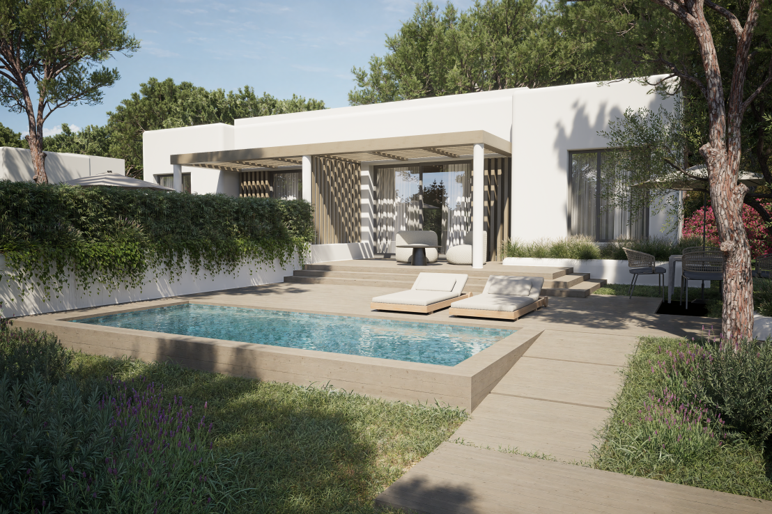 The semi-detached villas offer around 55 m² of interior space, a 20 m² terrace and plots of approximately 332 m². Each villa includes its own private swimming pool, while also enjoying access to the communal pool and shared areas.