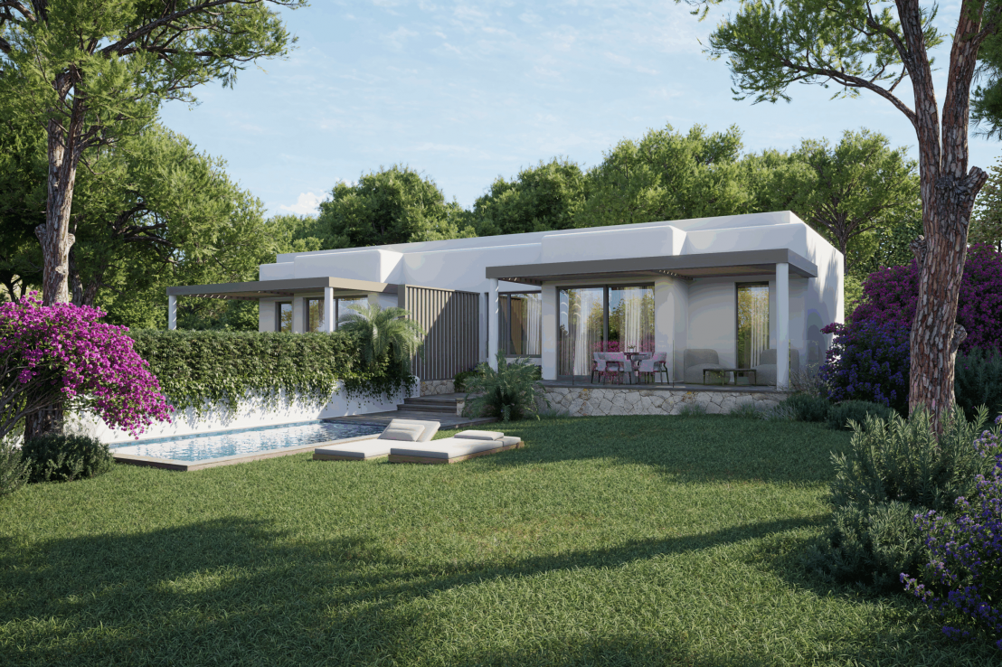The detached villas feature approximately 111 m², three bedrooms, two bathrooms and a 28 m² terrace on plots of around 520 m². Each unit benefits from a private swimming pool, providing maximum comfort and privacy.