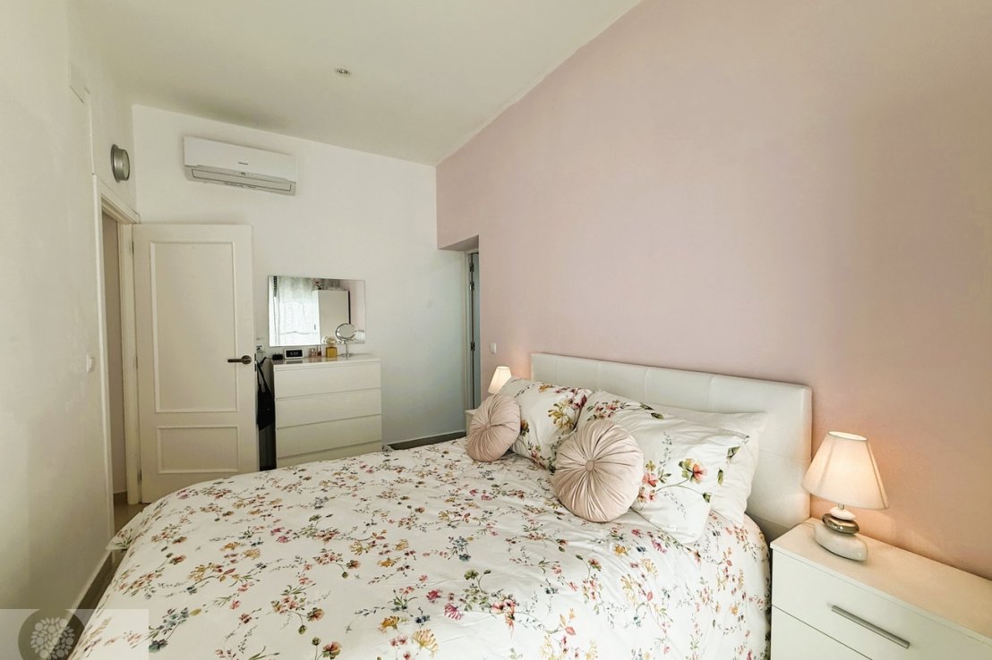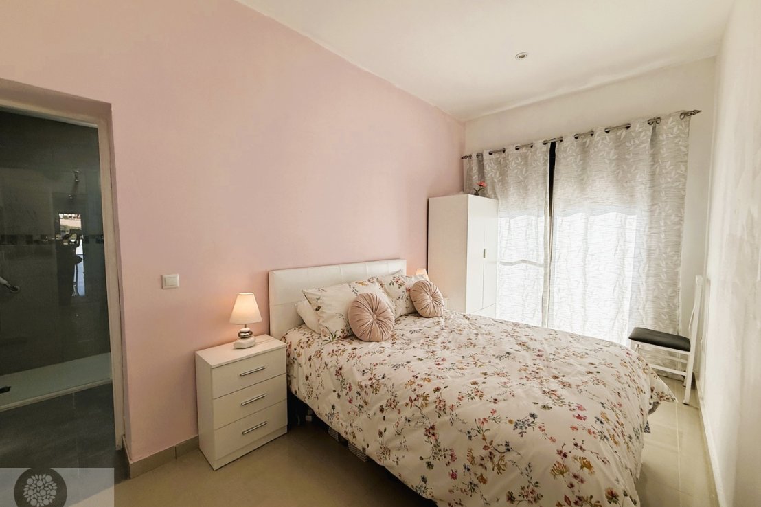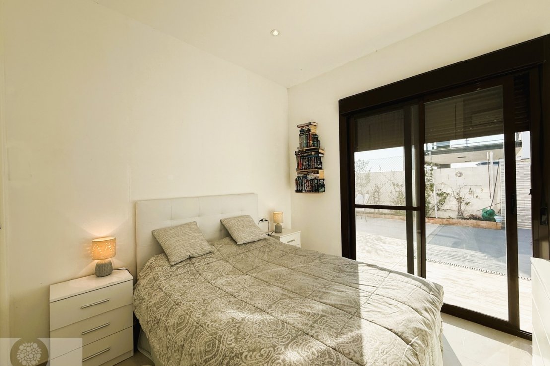 It features 3 bedrooms with fitted wardrobes, 2 full bathrooms and an additional guest toilet. The spacious living-dining area provides direct access to the outdoor space with a private swimming pool, perfect for enjoying the sunny climate all year round.